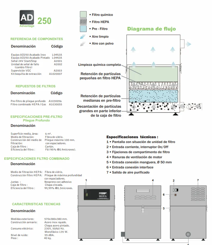 Los equipos de filtración de humos AD 250 incorporan la nueva tecnología del pre-filtro, DEEP PLEAT (pliegue profundo), así como los nuevos filtros de carbón activo, que proporcionan una mejora en el rendimiento del pre-filtro y del filtro asegurando un mayor rendimiento del mismo. Como resultado ofrece, mayor eficacia y rentabilidad al sistema.